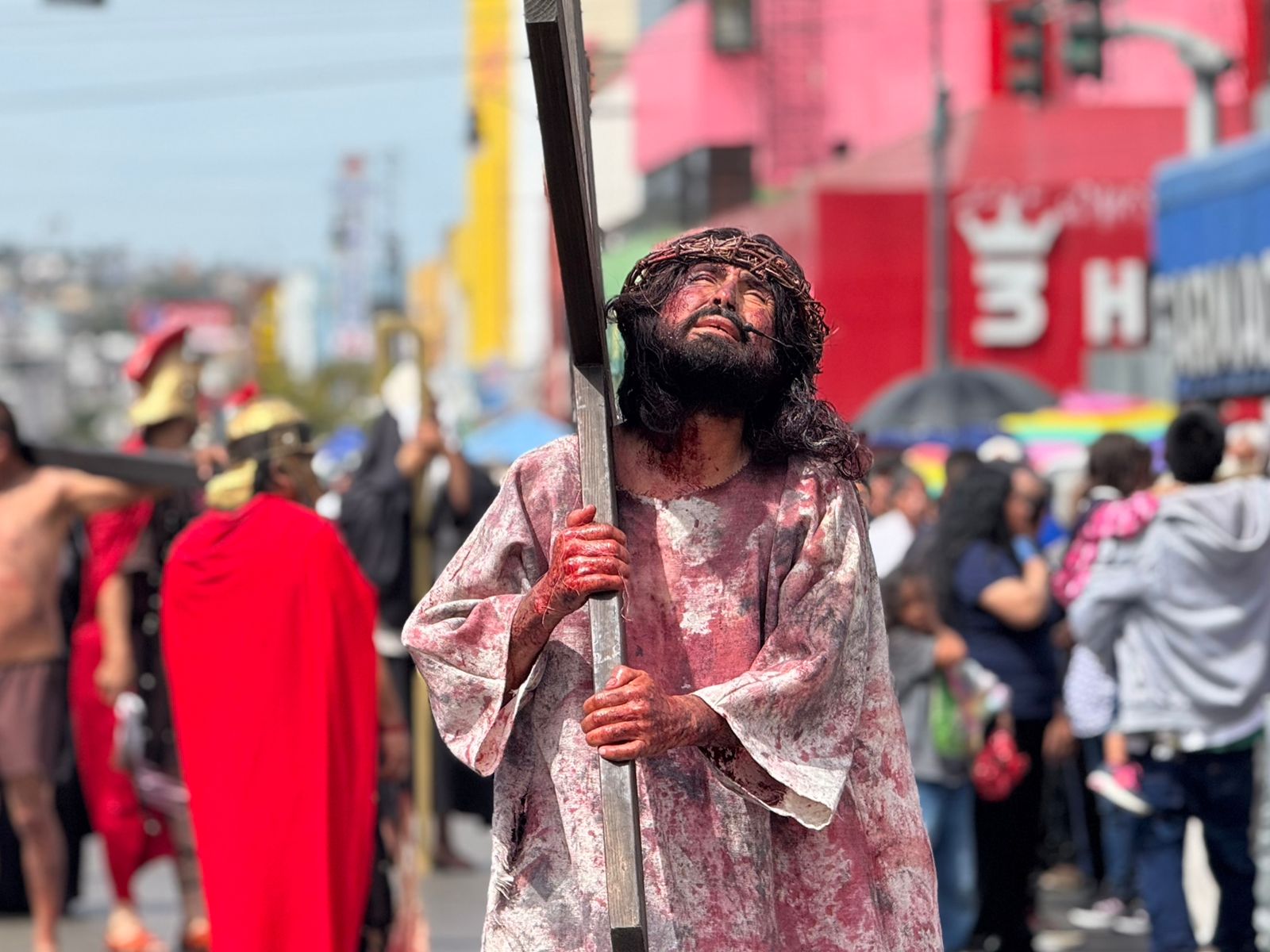 El contingente avanza por distintas vialidades del primer cuadro de la ciudad y tiene como destino final el Santuario de la Virgen de Guadalupe, donde concluirá esta actividad religiosa realizada en el marco de la Semana Santa.