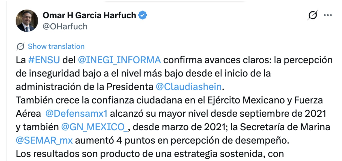 El titular de seguridad, Omar García Harfuch, informó a través de sus redes sociales que los resultados más recientes de la INEGI reflejan avances importantes en materia de seguridad en el país.