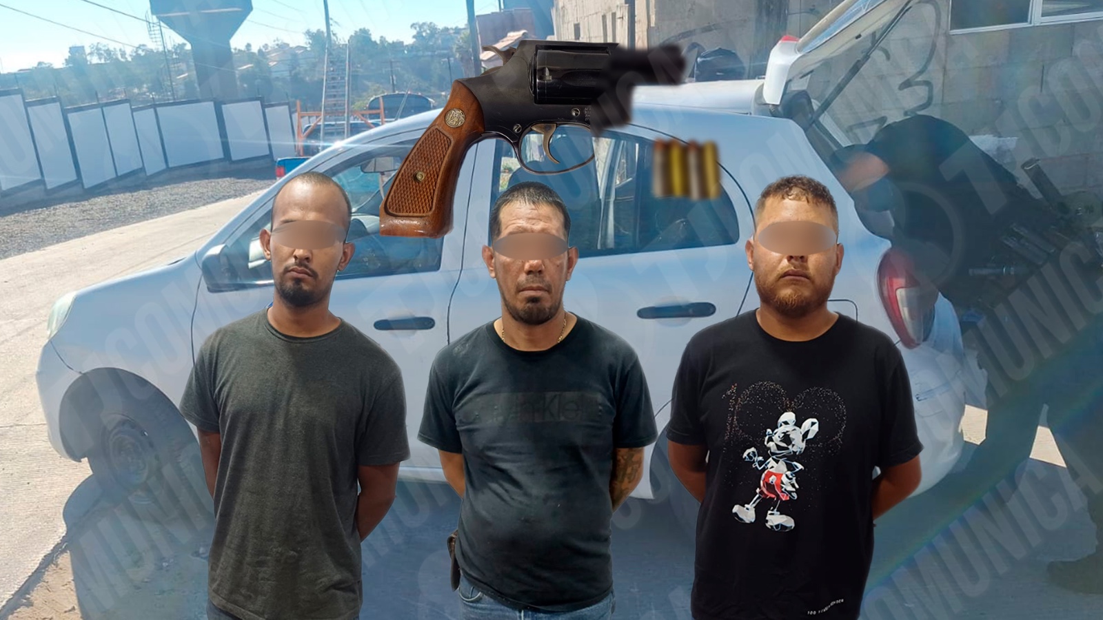 Los tres sujetos fueron puestos a disposición de las autoridades correspondientes, junto con el arma decomisada: un revólver color café con negro, calibre .38 SPL, con cuatro cartuchos útiles en el cilindro, así como el vehículo Nissan March.