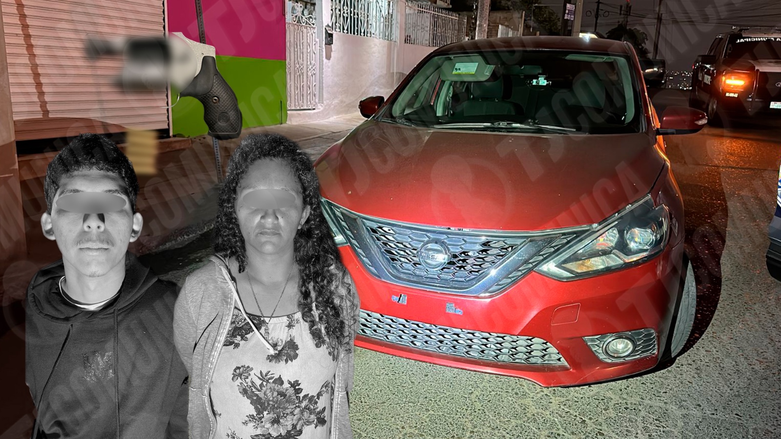 Se les decomisó un arma de fuego tipo revólver, abastecida con cinco cartuchos útiles, y un vehículo sedán, marca Nissan Sentra.