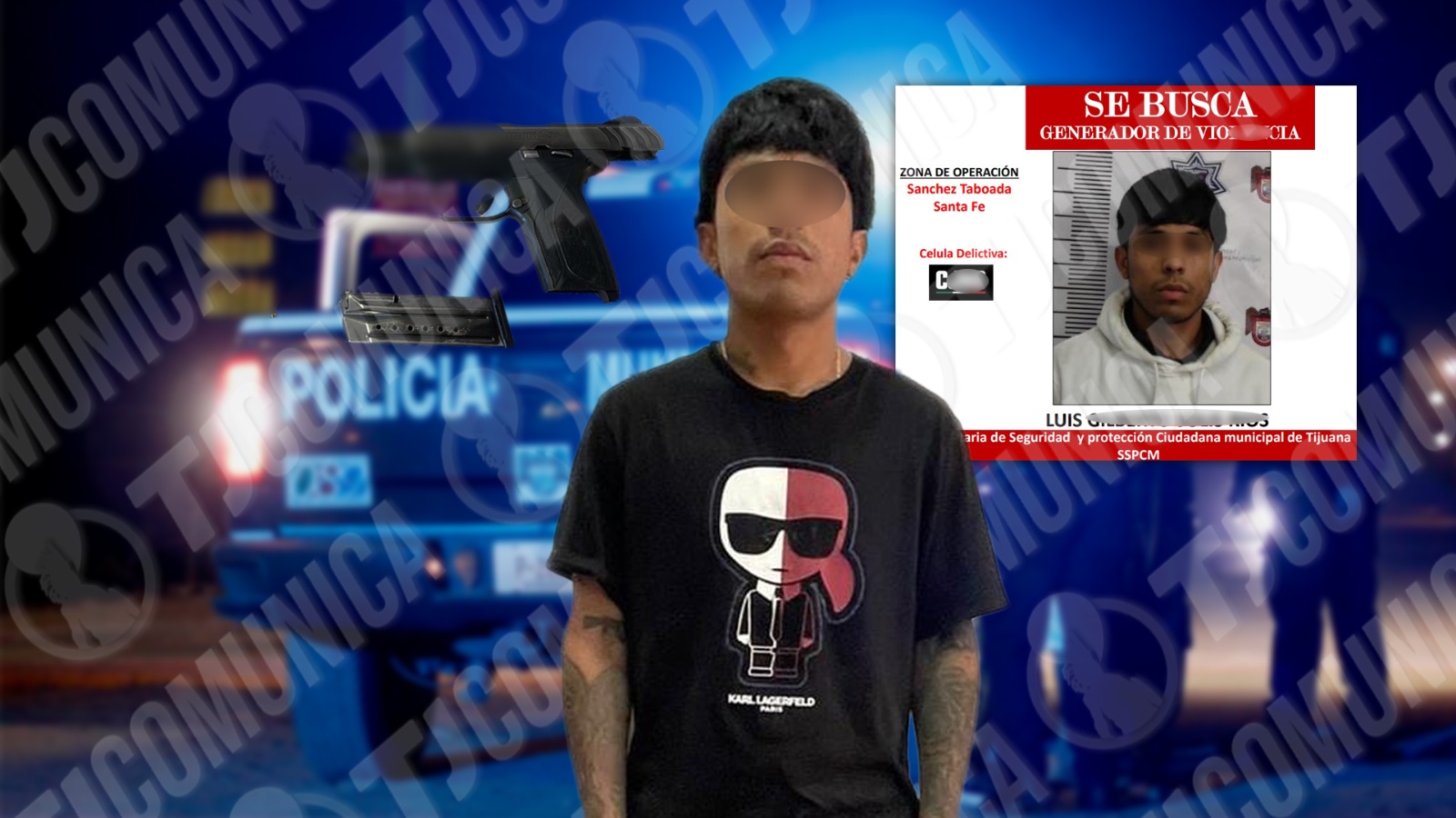 El detenido fue identificado como Luis “N”, de 23 años de edad, originario de Tijuana, quien fue sorprendido en posesión de un arma de fuego tipo pistola calibre 9 milímetros, marca Ruger, con un cargador abastecido con 15 cartuchos útiles. El joven también contaba con una ficha de búsqueda por ser generador de violencia en la zona de la Sánchez Taboada y Santa Fe, donde, según el reporte, pertenece a la célula delictiva del CJNG.