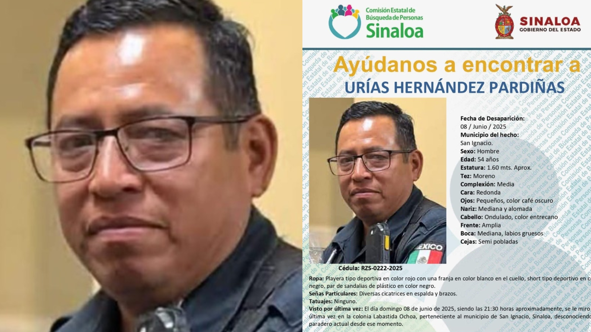 De acuerdo con la ficha de búsqueda, Hernández fue visto por última vez en la colonia Labastida Ochoa, dentro del municipio de San Ignacio, aproximadamente a las 9:30 de la noche.