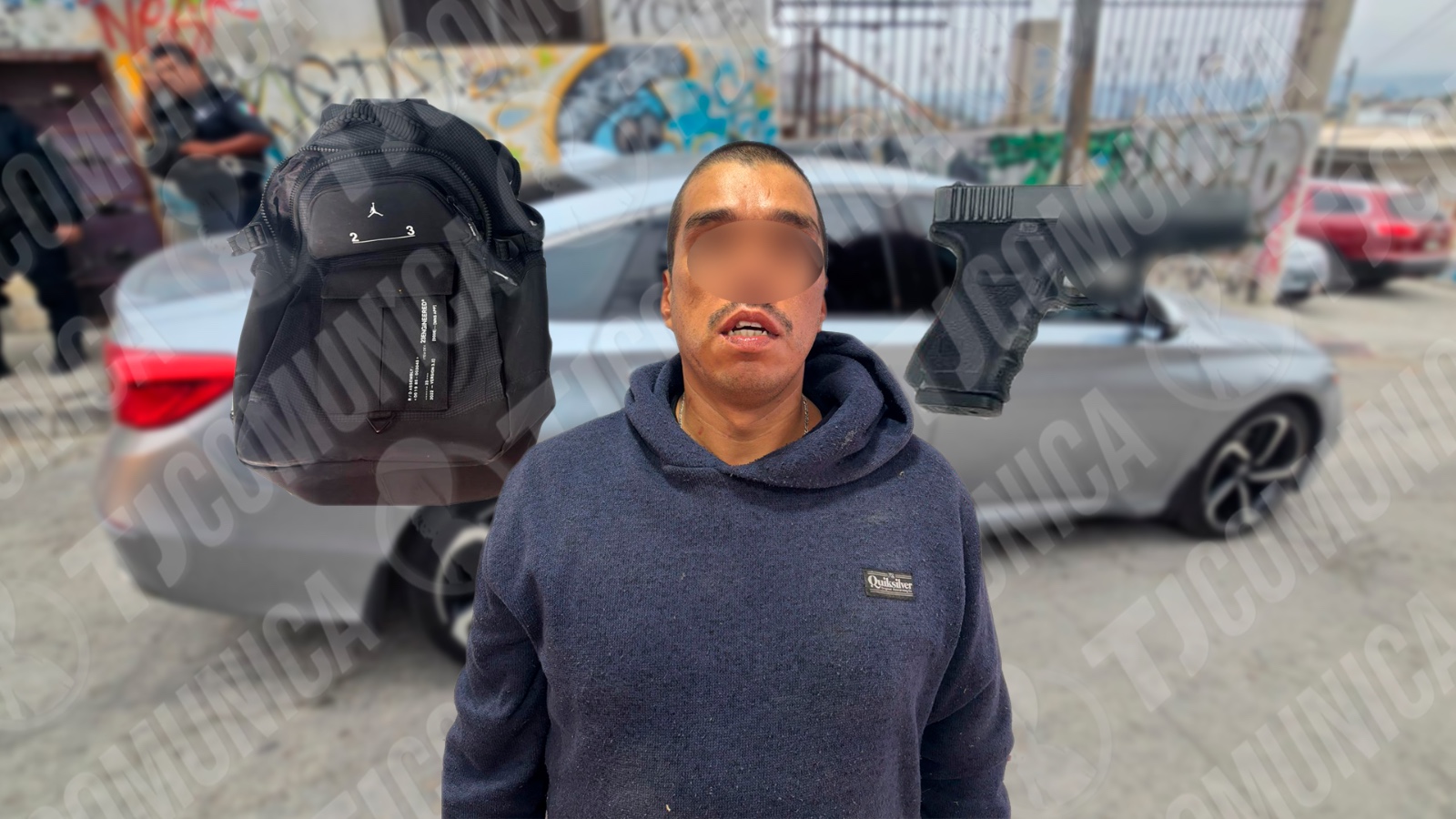 Hombre portaba una mochila negra que contenía una pistola de utilería tipo Glock 19. El vehículo y el arma fueron asegurados como evidencia.