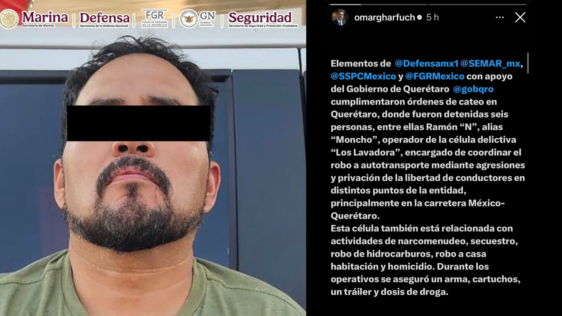 El secretario de Seguridad y Protección Ciudadana, Omar García Harfuch, informó que elementos de la Defensa, Semar, SSPC y la FGR cumplimentaron órdenes de cateo en Querétaro, donde fueron detenidas seis personas, entre ellas Ramón “N”, alias “Moncho”, operador de la célula criminal conocida como “Los Lavadora”.
