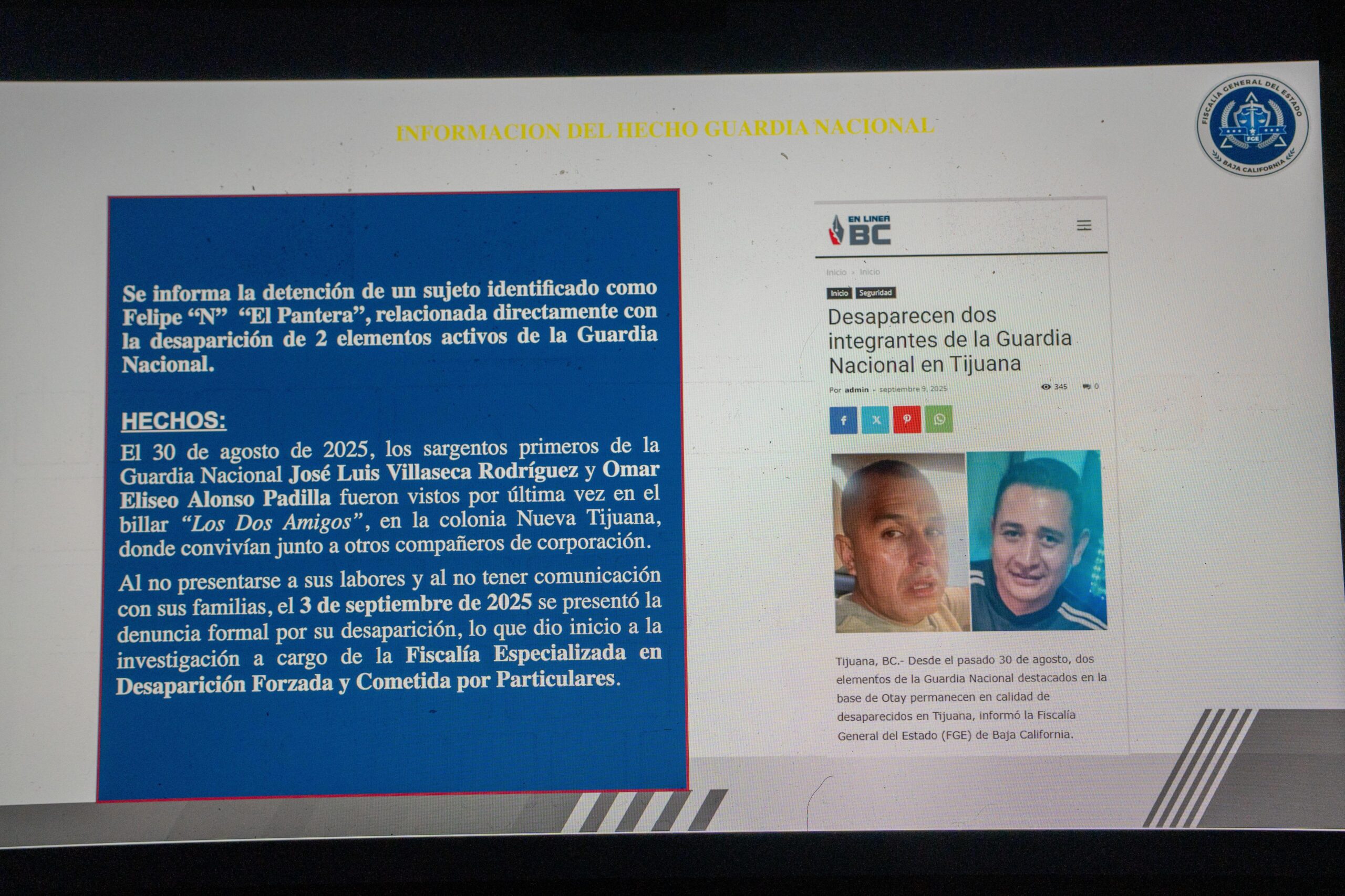 Una rueda de prensa, la Fiscalía General del Estado informó sobre la detención de Felipe “N”, alias El Pantera, señalado como presunto responsable de la desaparición de dos agentes de la Guardia Nacional en Tijuana.