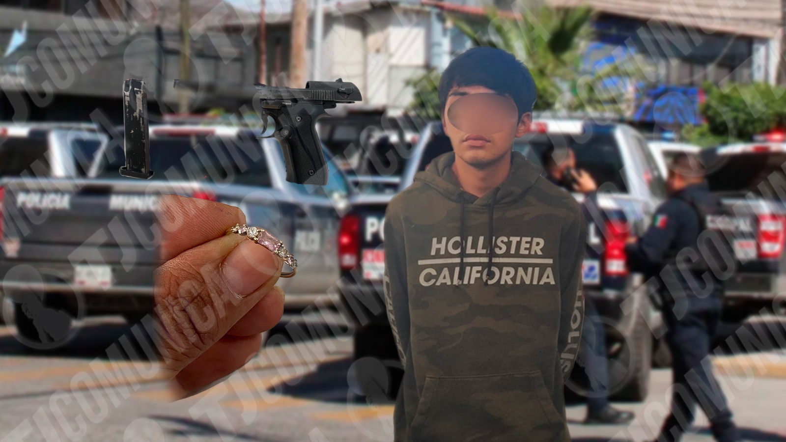 La detención ocurrió alrededor de la mañana cuando la central de radio recibió un reporte de robo sobre la calle Agua Caliente. La víctima, identificada como Alondra “N”, de 22 años, indicó que un sujeto armado la despojó de un anillo de oro de 14 kilates con piedras color rosa y proporcionó la descripción del responsable.