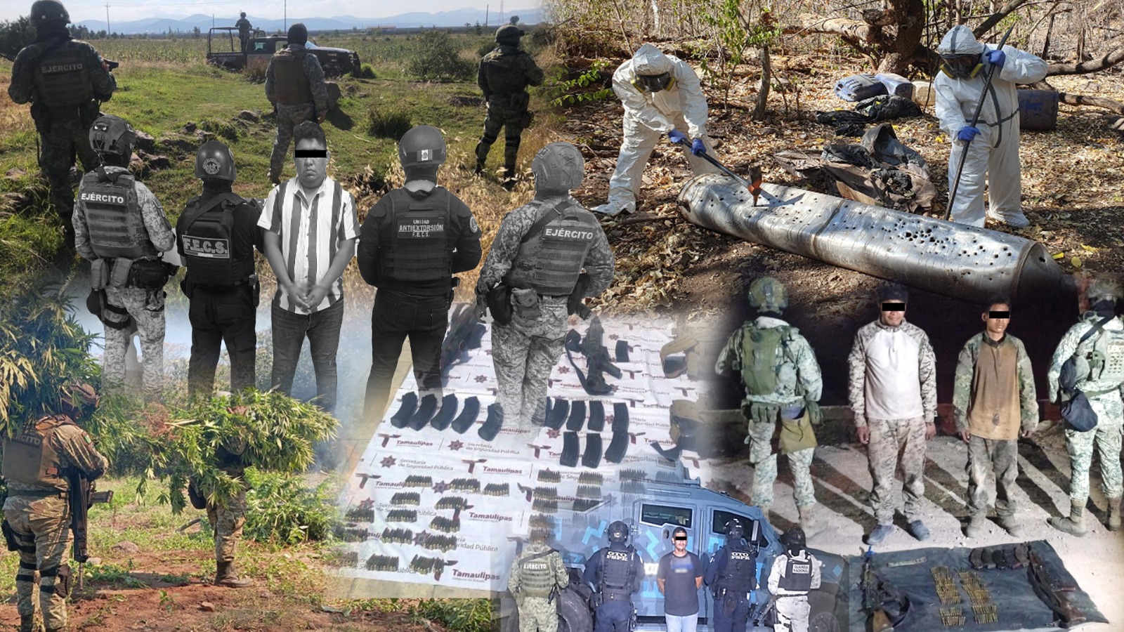 Y en Navolato, elementos del Ejército Mexicano, la GN y la Policía Estatal Preventiva, al realizar reconocimientos, detuvieron a cinco personas y aseguraron un fusil Barrett, cinco armas largas, un arma corta, 28 cargadores, 1,170 cartuchos, dos granadas y dos vehículos blindados. Entre los detenidos se encuentra un hombre vinculado a una célula delictiva.