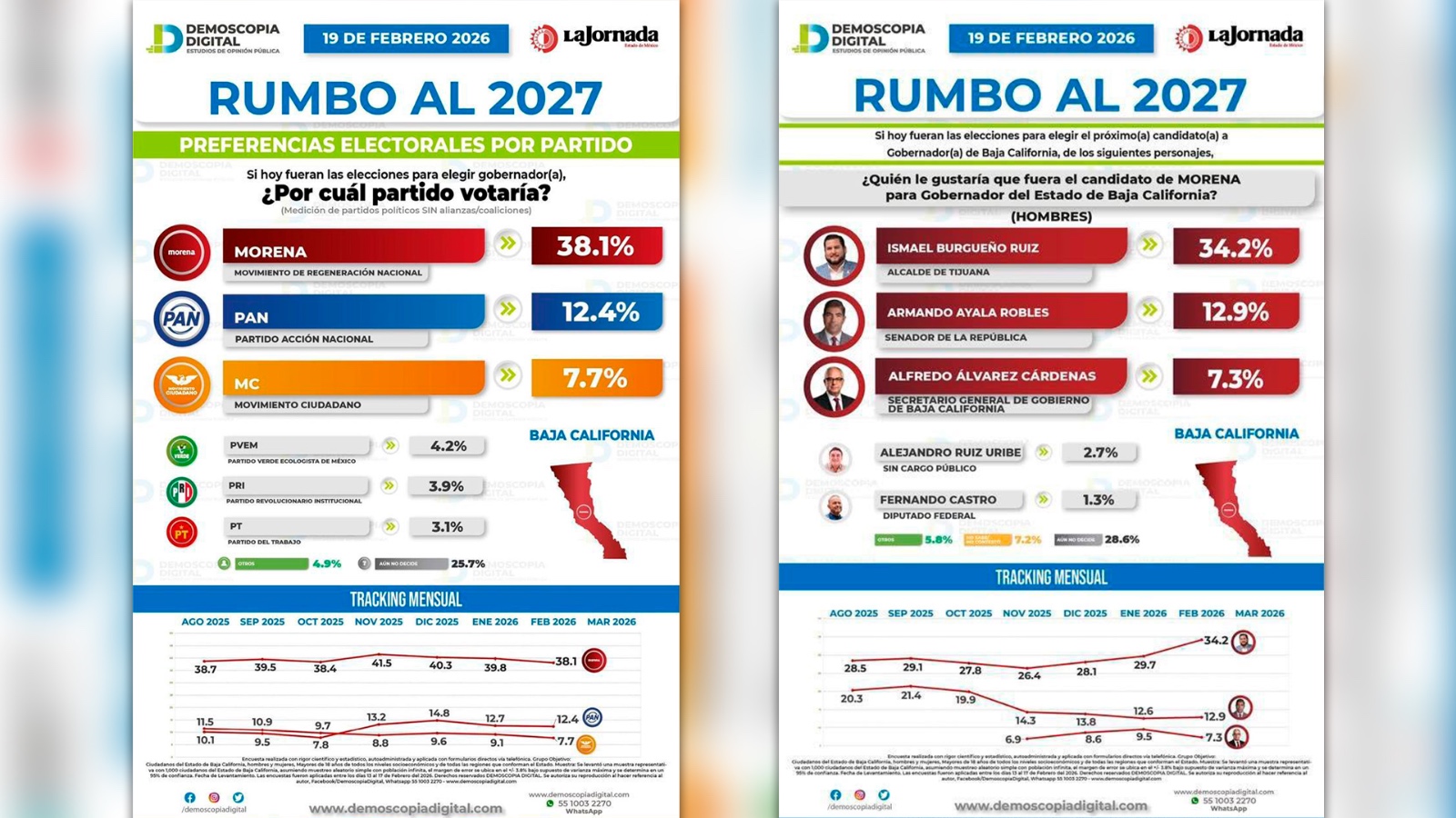 La encuesta fue levantada entre el 13 y el 17 de febrero de 2026 en el estado de Baja California, y muestra ya una marcada ventaja para el partido oficial, con el alcalde tijuanense como el mejor colocado por las preferencias.