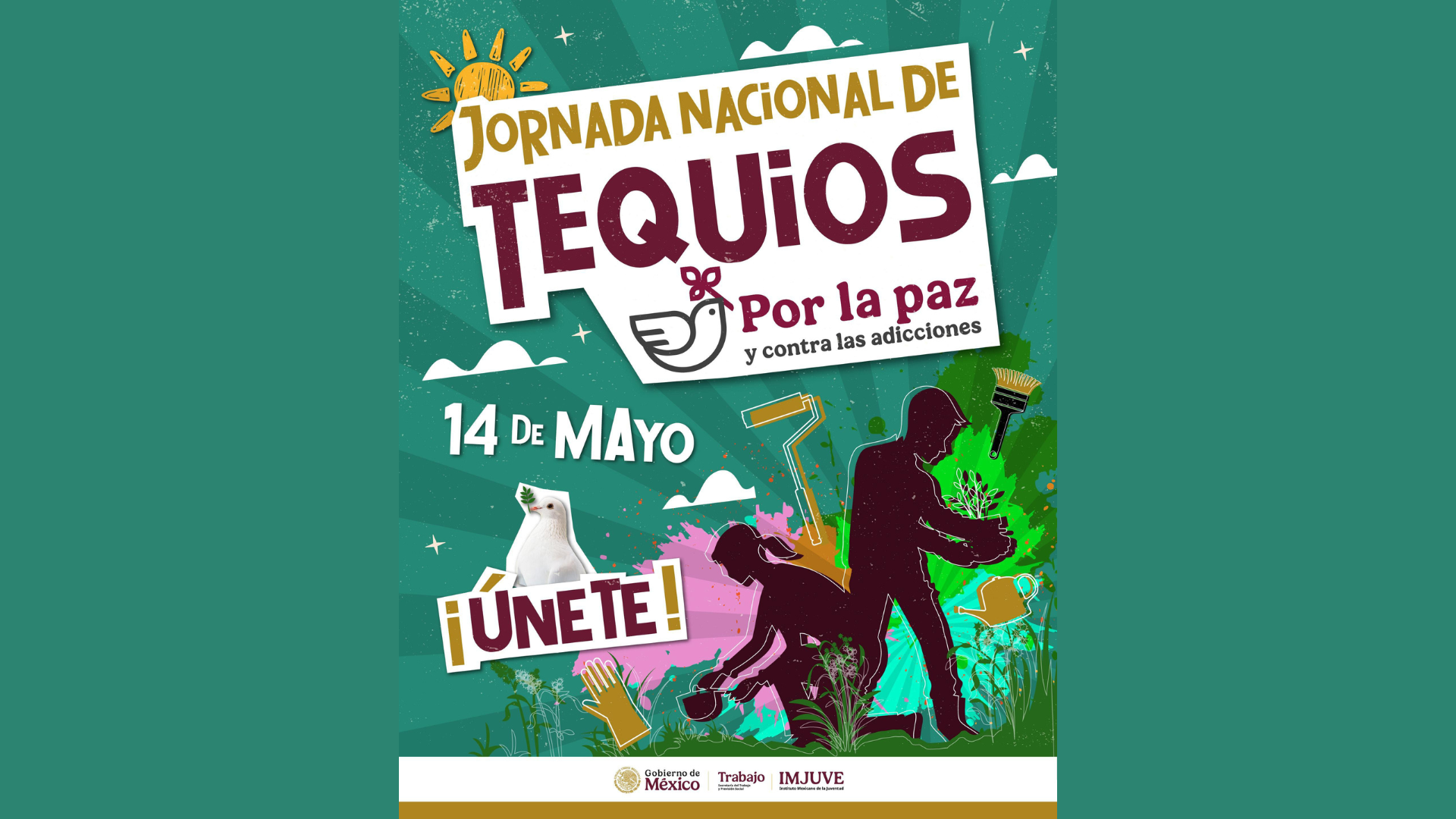 El Instituto Mexicano de la Juventud (IMJUVE) convoca a las y los jóvenes de las 32 entidades federativas a participar en la “Jornada Nacional de Tequios por la Paz y contra las Adicciones”, que se realizará este 14 de mayo como parte de la estrategia nacional “Por la Paz y Contra las Adicciones” que impulsa el Gobierno de México.