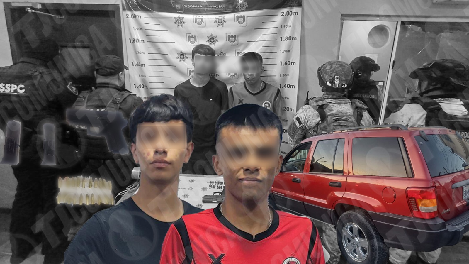 Derivado de lo anterior, Alexis Samuel “G”, de 22 años y originario de Tijuana, y Rolando “R”, de 19 años y originario de Tijuana, fueron detenidos y trasladados a la Fiscalía General de la República (FGR) por el delito de portación de arma.