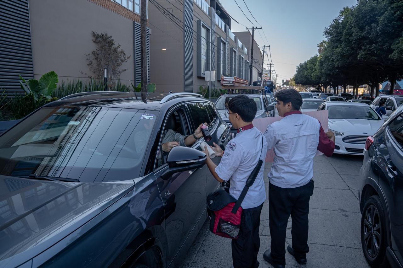 Dos jóvenes estudiantes de gastronomía de la Universidad Vizcaya de las Américas, Mario Alberto Valenzuela y Raúl Vázquez, emprendieron la venta de aguas frescas embotelladas en el crucero ubicado frente al Centro de Atención a Solicitantes (CAS), con el objetivo de recaudar fondos para viajar a Francia, donde realizarán sus prácticas profesionales.