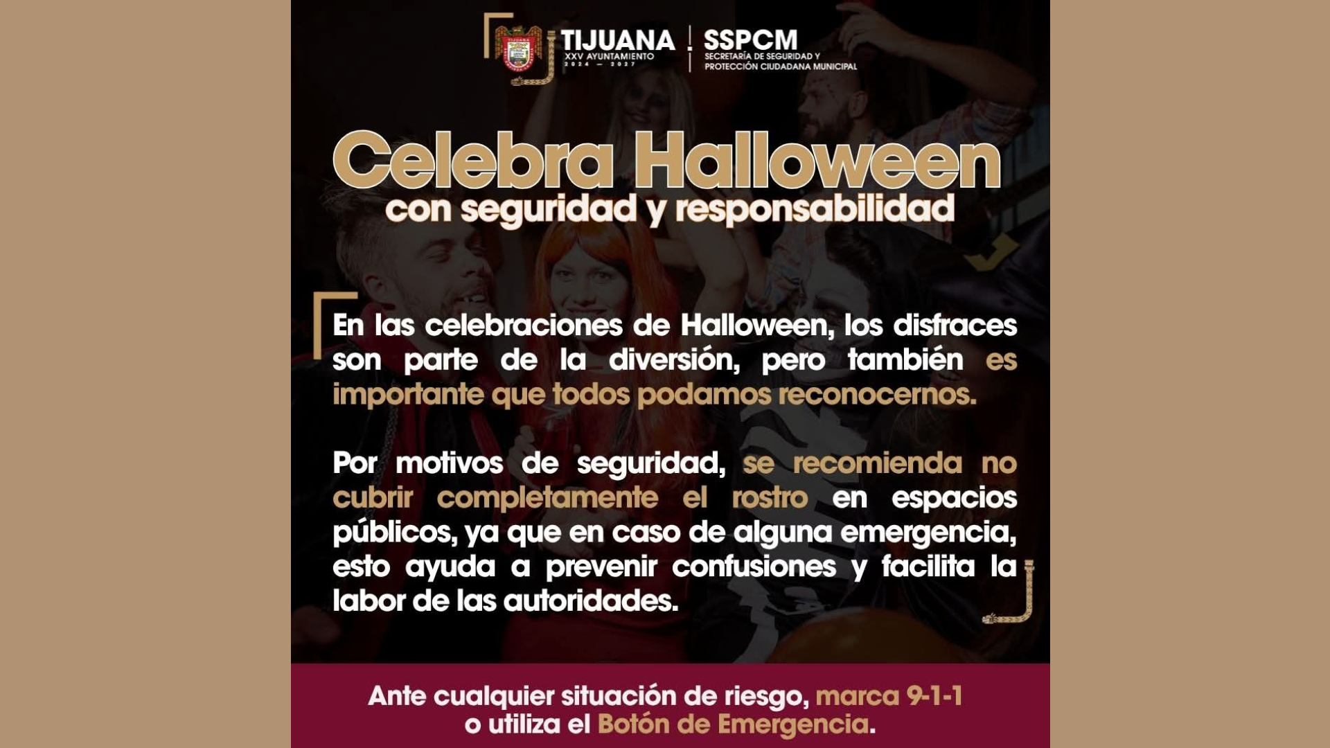 Tijuana, B. C., a 29 de octubre de 2025.- Con el propósito de salvaguardar la integridad de las familias tijuanenses durante las celebraciones de Halloween, la Secretaría de Seguridad y Protección Ciudadana Municipal (SSPCM) hace un llamado a la comunidad a disfrutar estas fechas con responsabilidad y atendiendo las medidas preventivas emitidas por la autoridad.