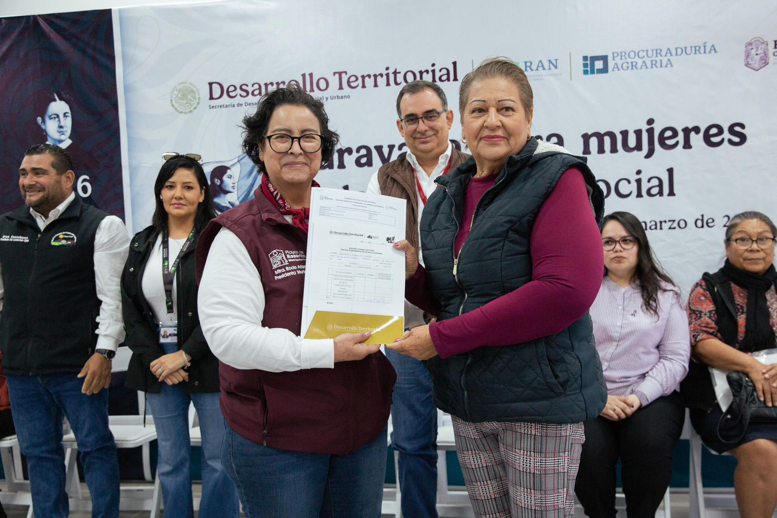 El evento contó con la participación de autoridades de los tres órdenes de gobierno, entre ellas Enrique Manuel Cunningham Santana, titular de la Oficina de Representación de SEDATU en Baja California; Geovanna Teresa Loreto Aceves, titular del Registro Agrario Nacional en el estado; Juan José Orozco Rodríguez, encargado de despacho de la Procuraduría Agraria en Baja California; así como la directora de IMMUJER, Iramí Cortez de los Ángeles.