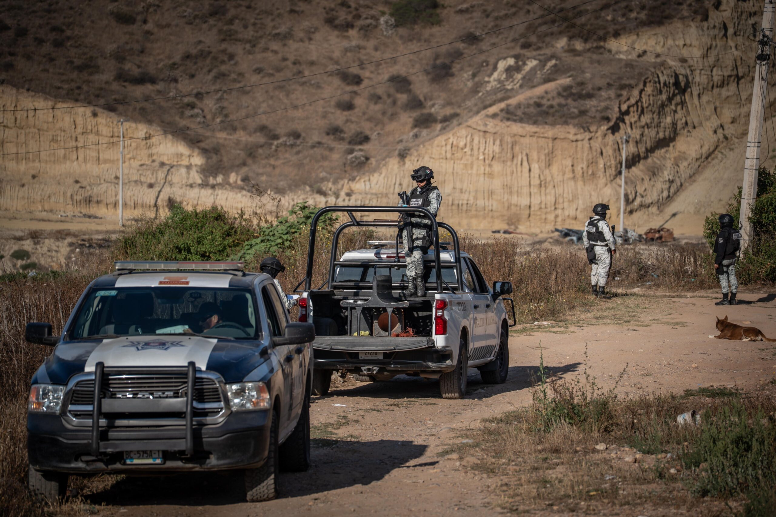 Elementos de la Policía Municipal y Guardia Nacional realizan un operativo de seguridad en la zona, en espera de agentes de la Fiscalía General del Estado que arriben para realizar el peritaje correspondiente.