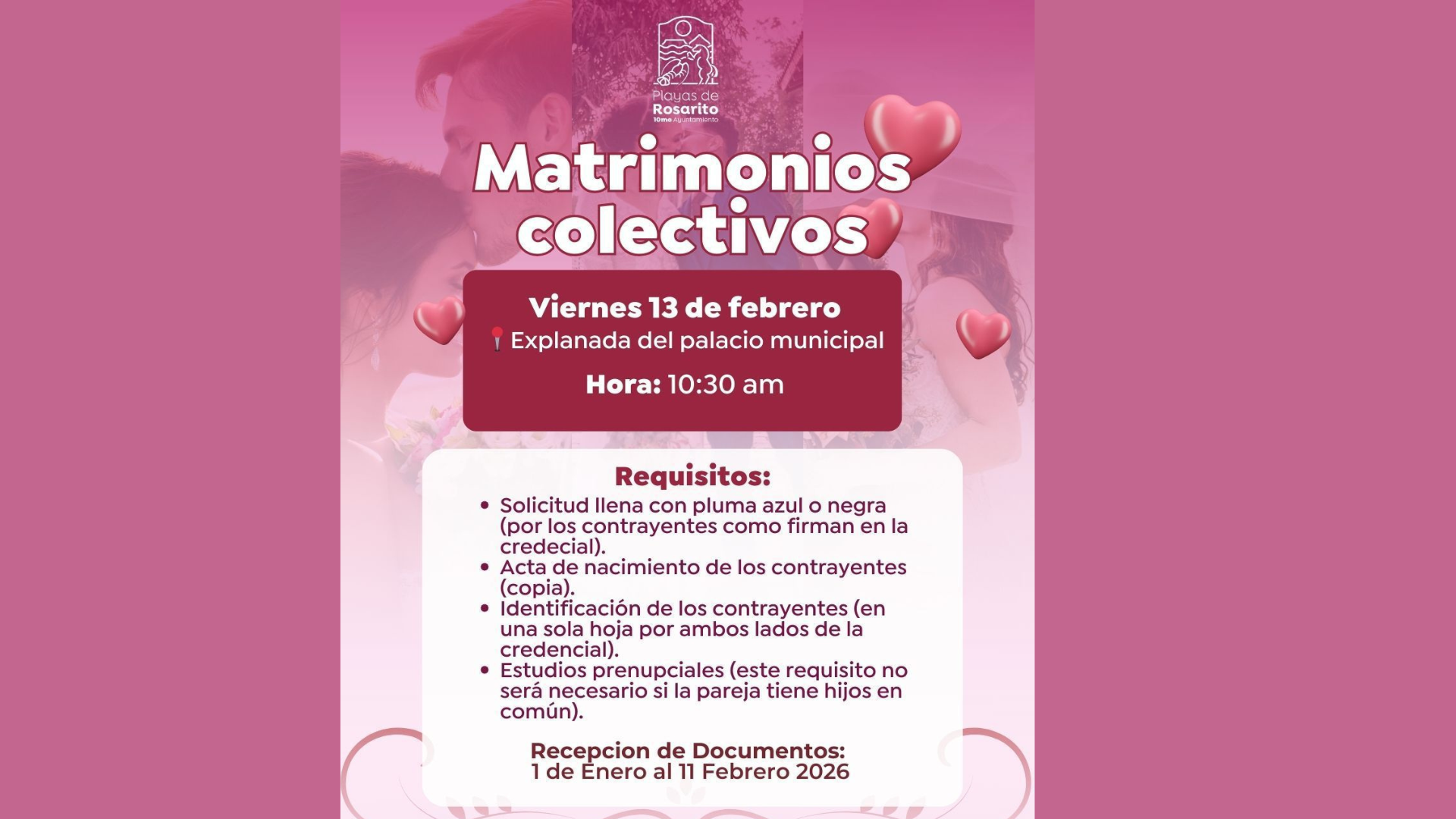 El 10° Ayuntamiento de Playas de Rosarito, encabezado por la presidenta municipal Rocío Adame, a través del Registro Civil, invita a la ciudadanía a participar en el programa de Matrimonios Colectivos 2026, una acción que promueve la certeza jurídica y el fortalecimiento de las familias del municipio.