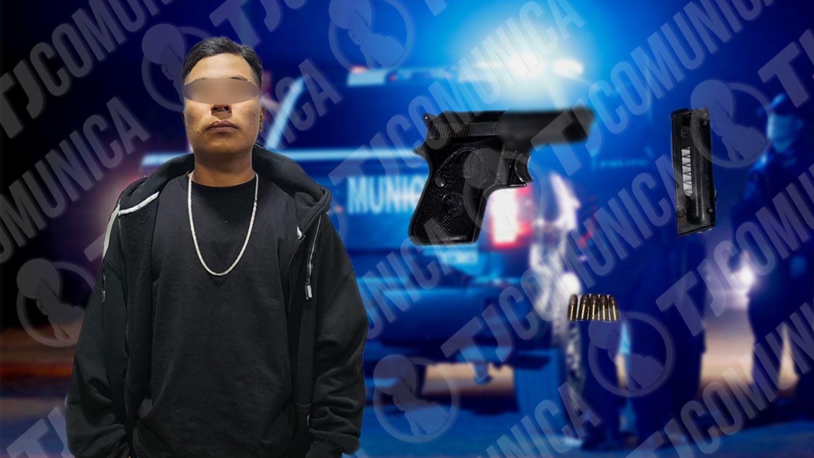 Durante el despliegue, elementos de la Unidad Táctica Especial de Tijuana aseguraron a Jaziel “N”, de 21 años, originario de Oaxaca, quien fue detenido en posesión de un arma de fuego tipo pistola, marca Beretta, calibre .22, color negro, con un cargador metálico abastecido con cinco cartuchos útiles.