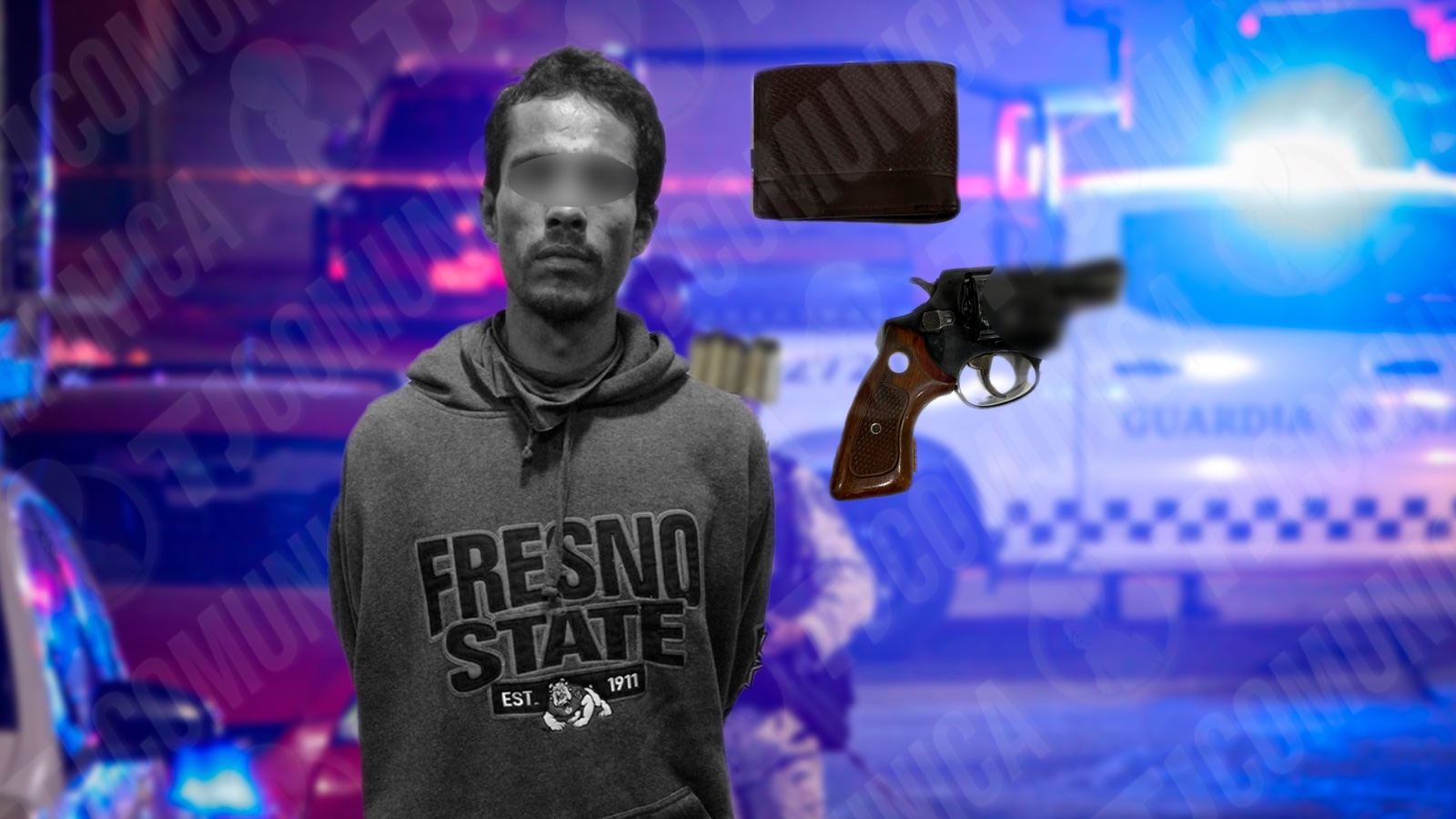 El detenido cargaba un arma tipo revolver (Marca Taurus, calibre .38 especial) abastecida con cinco cartuchos útiles, por lo que fue presentado a la Fiscalía General del Estado (FGE) por los delitos de robo con violencia en flagrancia y portación de arma de fuego.