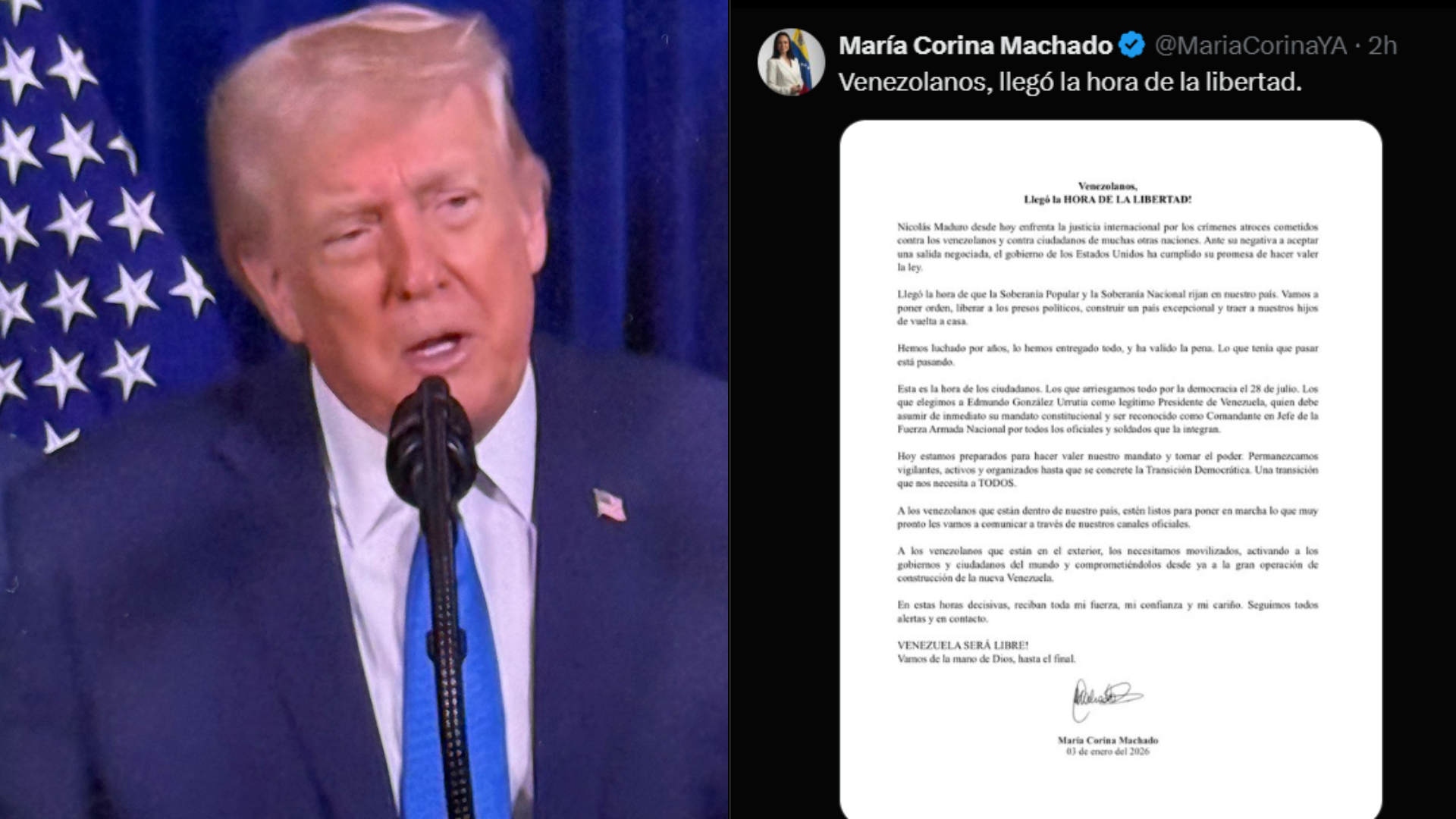 La líder opositora venezolana María Corina Machado compartió a través de redes sociales que Edmundo González Urrutia debe asumir como “legítimo presidente” de Venezuela, esto tras la captura de Maduro.