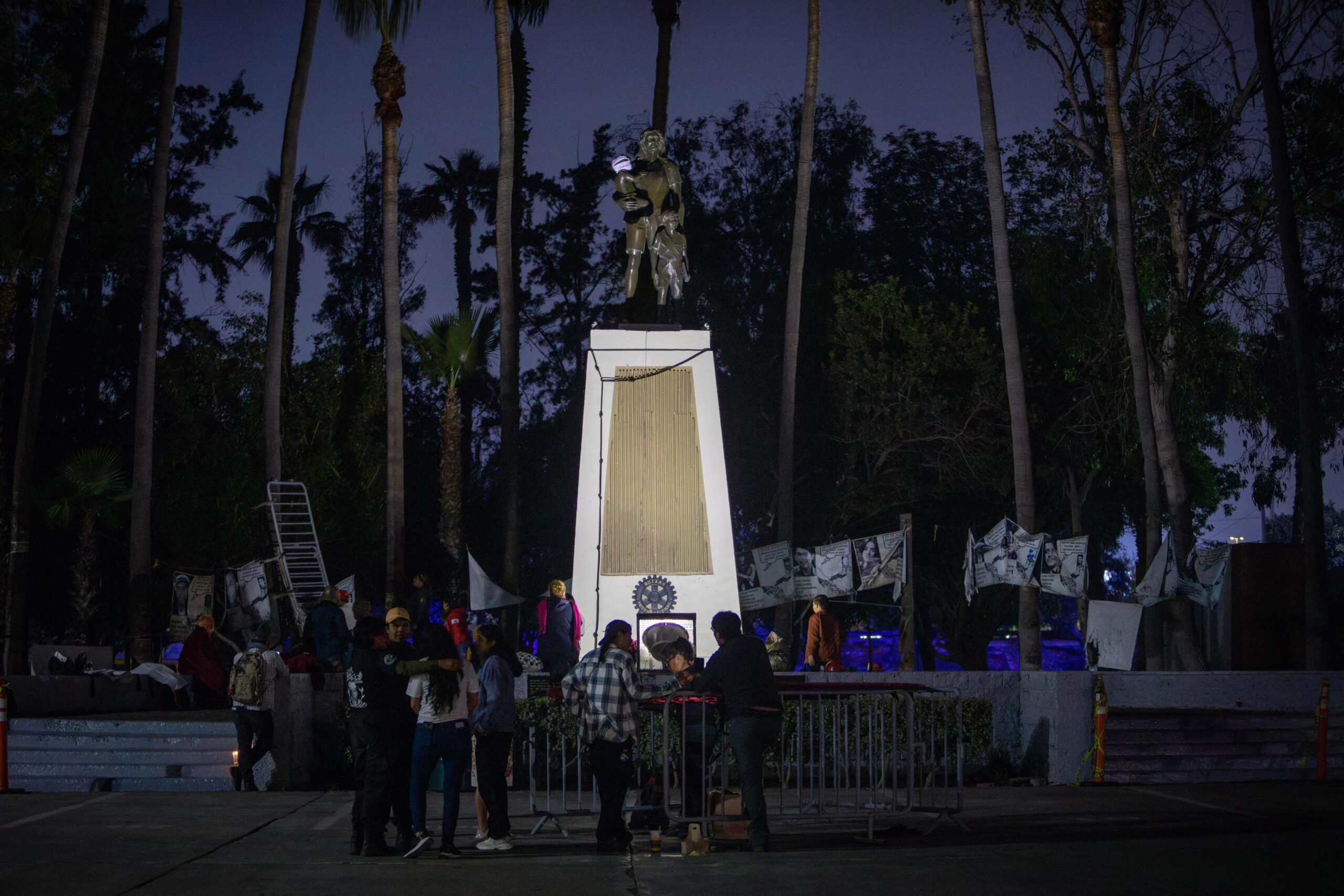 Como parte del homenaje, también se colocó un cubrebocas con la pregunta “¿Dónde están?” al pequeño que carga la figura femenina del Monumento a la Madre, en un intento por interpelar a la sociedad y a las autoridades.