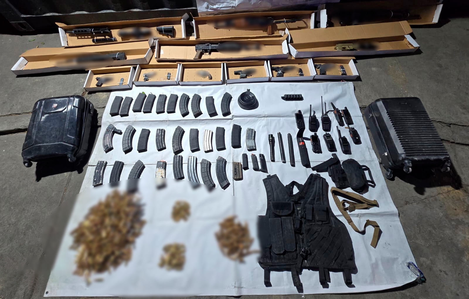 Entre lo asegurado destacan fusiles calibre 7.62×39 y .223, pistolas calibres 9 mm, .40, .45 y .22, además de radios de comunicación, chalecos tácticos, bastones retráctiles, gas lacrimógeno, miras telescópicas y un supresor metálico.