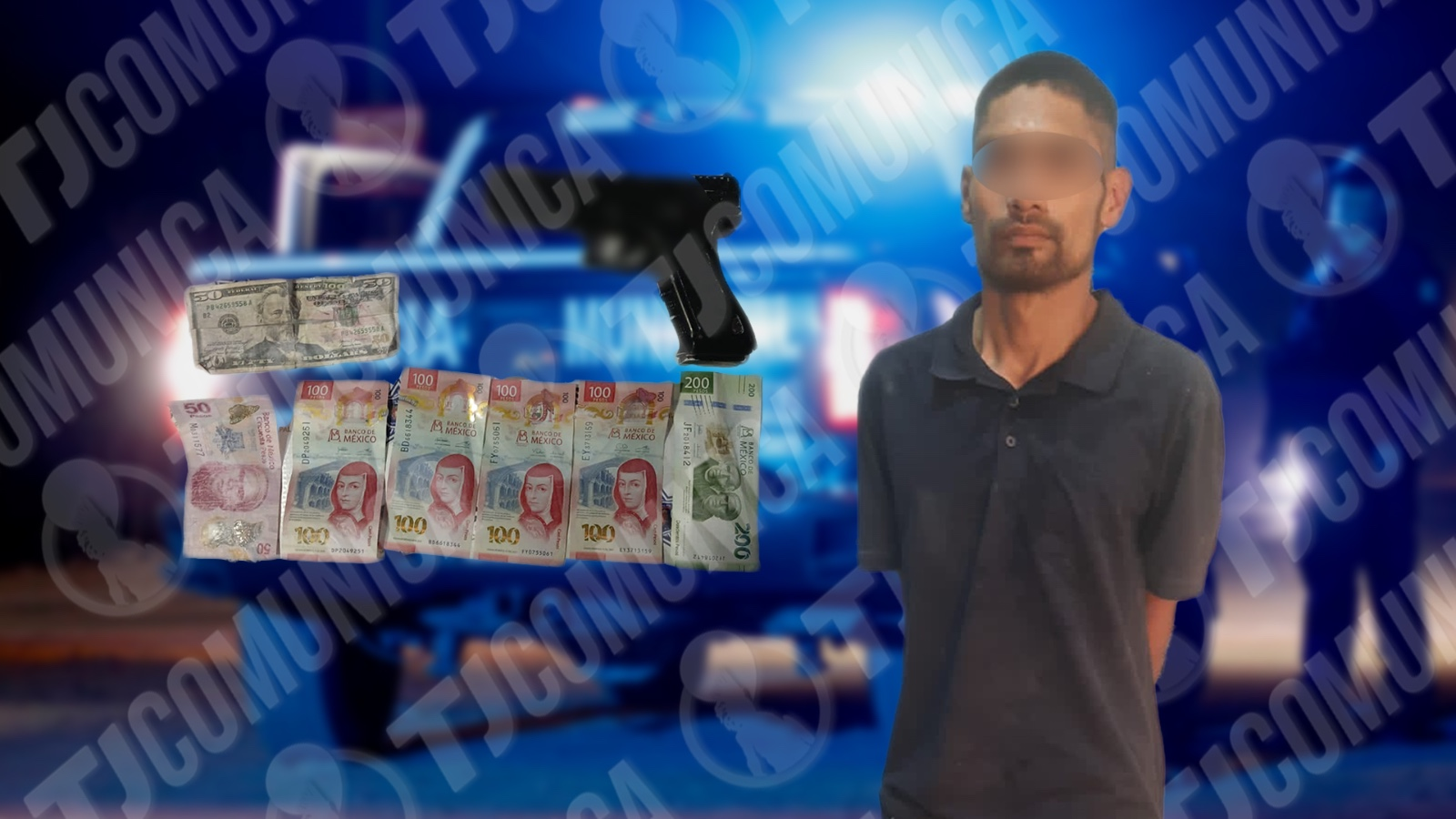 Tras cometer el robo, el sujeto huyó a pie sobre el bulevar Cuauhtémoc en dirección a la Gasolinera VIP, donde fue alcanzado y asegurado por los oficiales. Durante una inspección, se le localizaron 650 pesos, 50 dólares y un arma de utilería color negro.