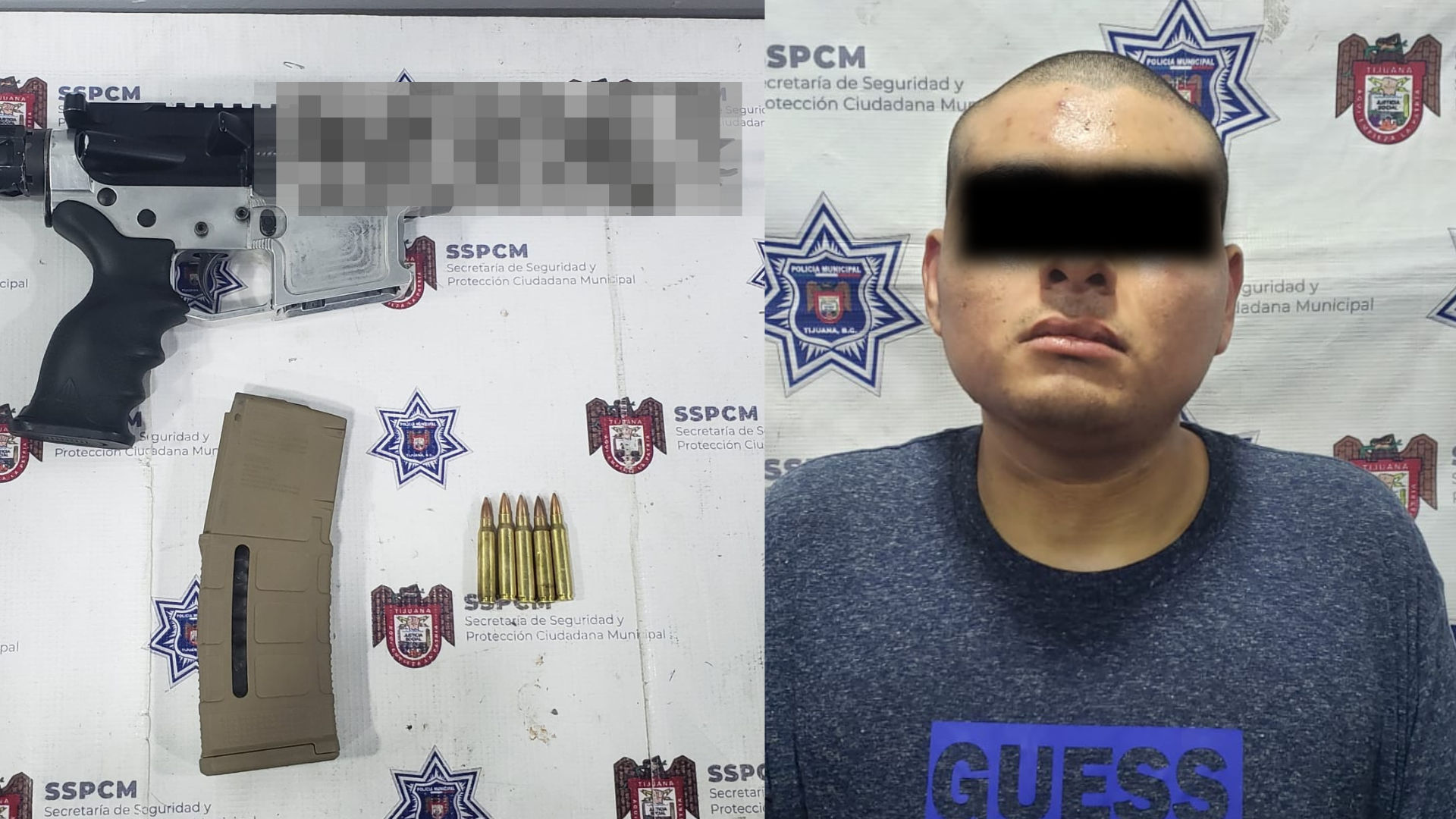 El detenido fue identificado como Jesús “N”, de 22 años de edad, originario de Tijuana. Durante la inspección al interior del vehículo, los oficiales localizaron un arma larga calibre .223 con detalles cromados y un cargador color café abastecido con cinco cartuchos útiles.