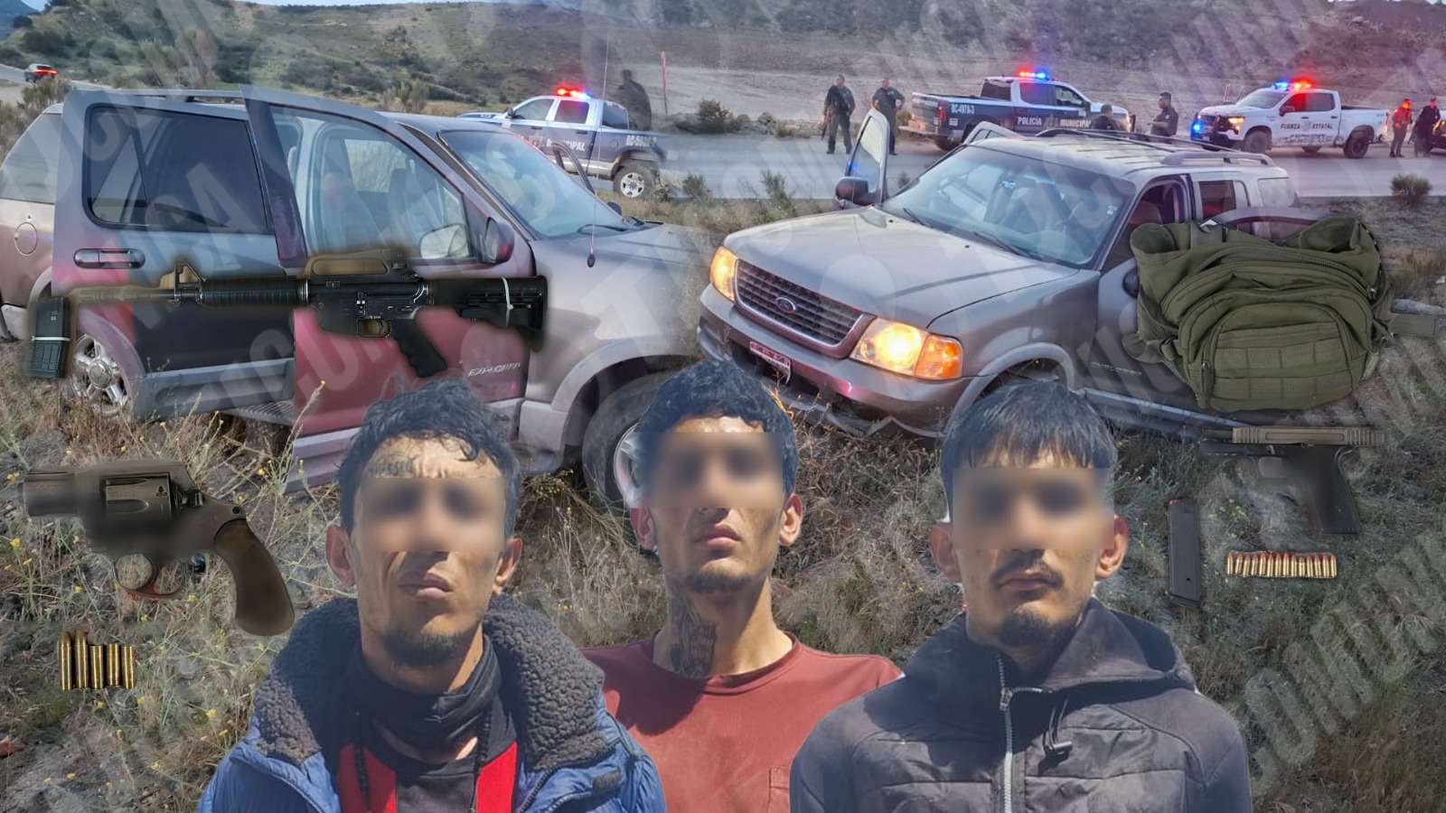 Al aproximarse al lugar, observaron a varios sujetos armados que abordaban una camioneta tipo vagoneta color verde olivo, iniciando una persecución que se extendió hasta el bulevar 2000. Durante la huida, los sospechosos abandonaron el vehículo, lo que derivó en una persecución a pie que culminó con la detención de tres hombres