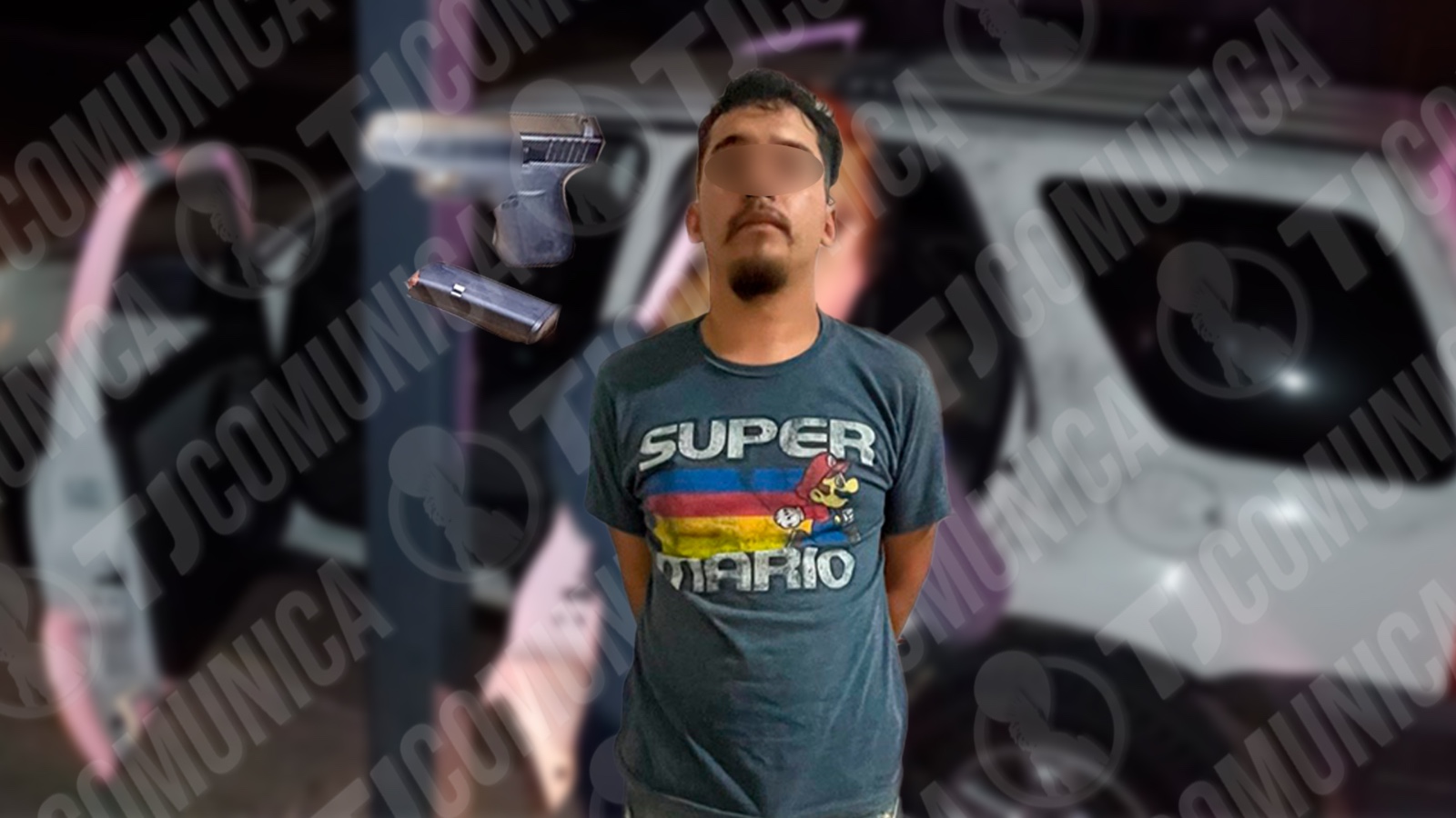 Al momento en el que los oficiales le hicieron la señal para que se detuviera, el sospechoso hizo caso omiso, comenzando una persecución que terminó metros más adelante. En cuanto los elementos se acercaron al vehículo, se percataron de que en el portavaso se encontraba un arma de fuego tipo pistola (Marca Glock, leyenda 43 Austria 9X19) con un cargador 9mm.