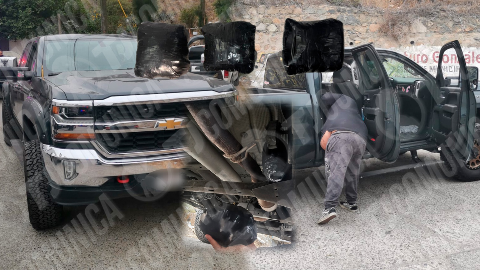 Elementos de la Policía Municipal lograron la detención de una Mula Ciega en el cañón Guerrero. Una persona identificada como Xavier Pérez, denunció que debajo de su vehículo pickup Silverado había encontrado en el chasis, tres paquetes de color negro envueltos en cinta adhesiva de presunto crist4l con un peso aproximado de 7.72 kilos.