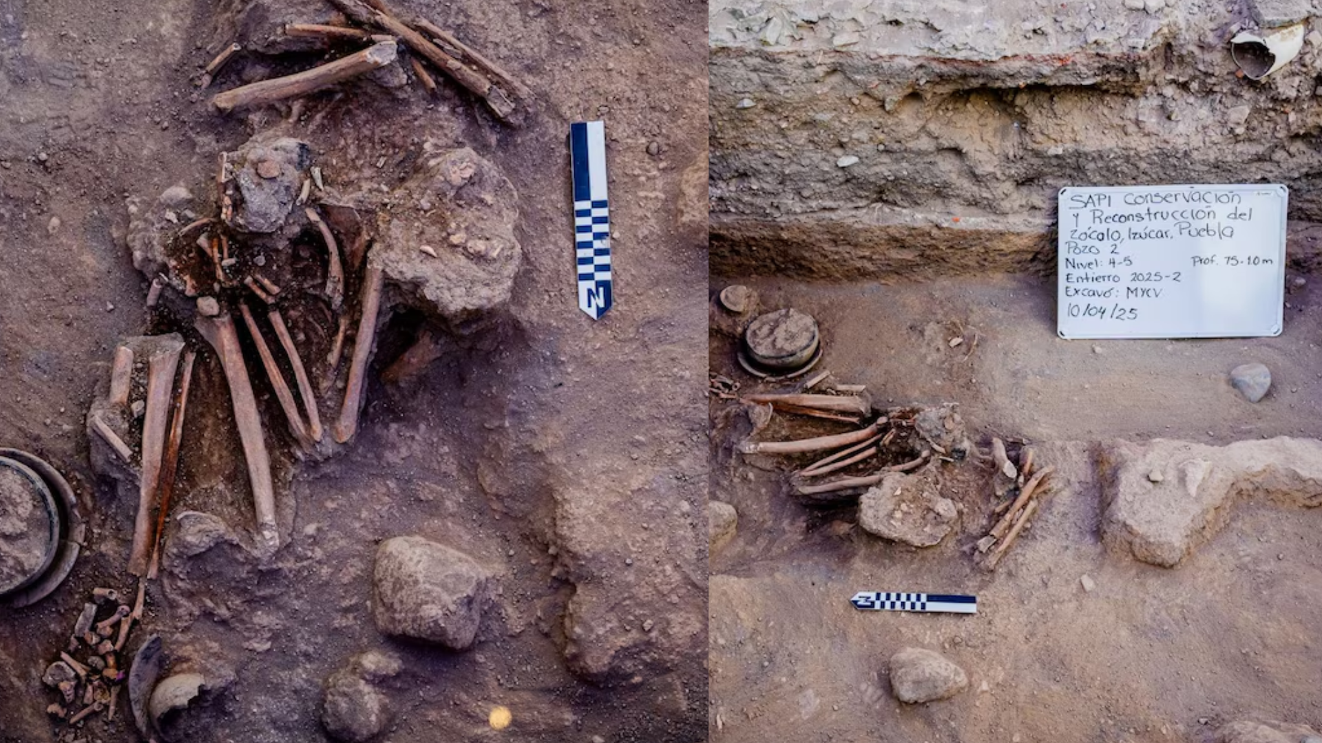 Bajo la plaza principal del municipio de Izúcar de Matamoros, en Puebla, descubrieron cinco osamentas humanas que, de acuerdo con arqueólogos del Instituto Nacional de Antropología e Historia (INAH), podrían tener hasta 800 años de antigüedad.