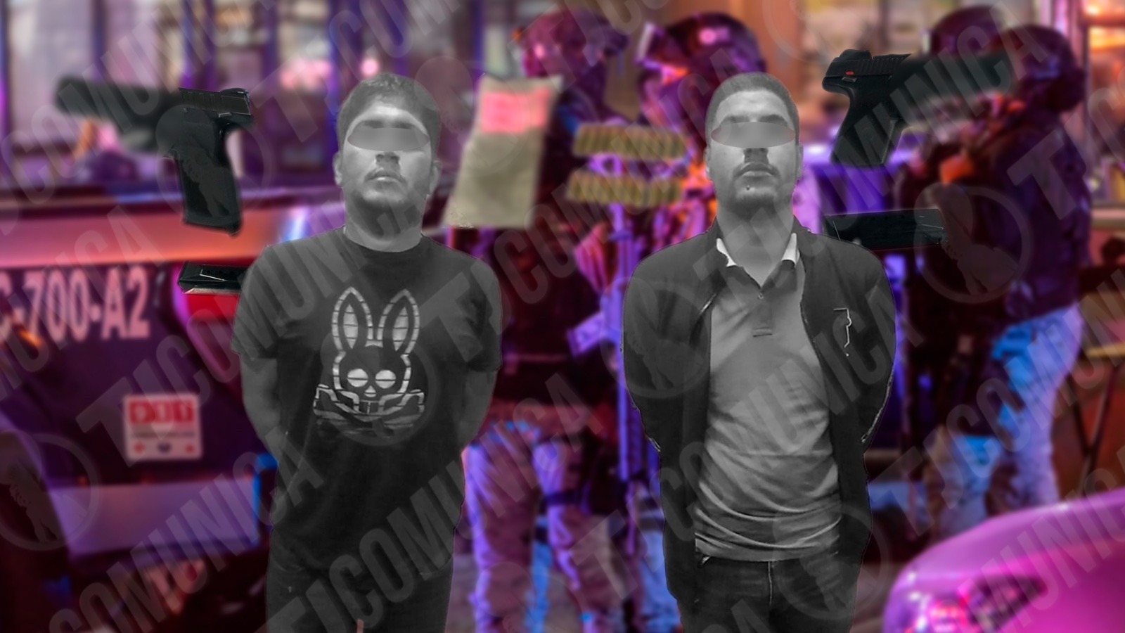 El primer detenido fue Miguel Antonio “V”, de 28 años de edad y originario de Sinaloa, mientras que el segundo detenido se identificó como Sergio Alejandro “R”, de 25 años y originario de Tijuana. Al realizarle una revisión precautoria a este último, se le localizó una bolsa de plástico con 32 tiros útiles calibre 9 mm.