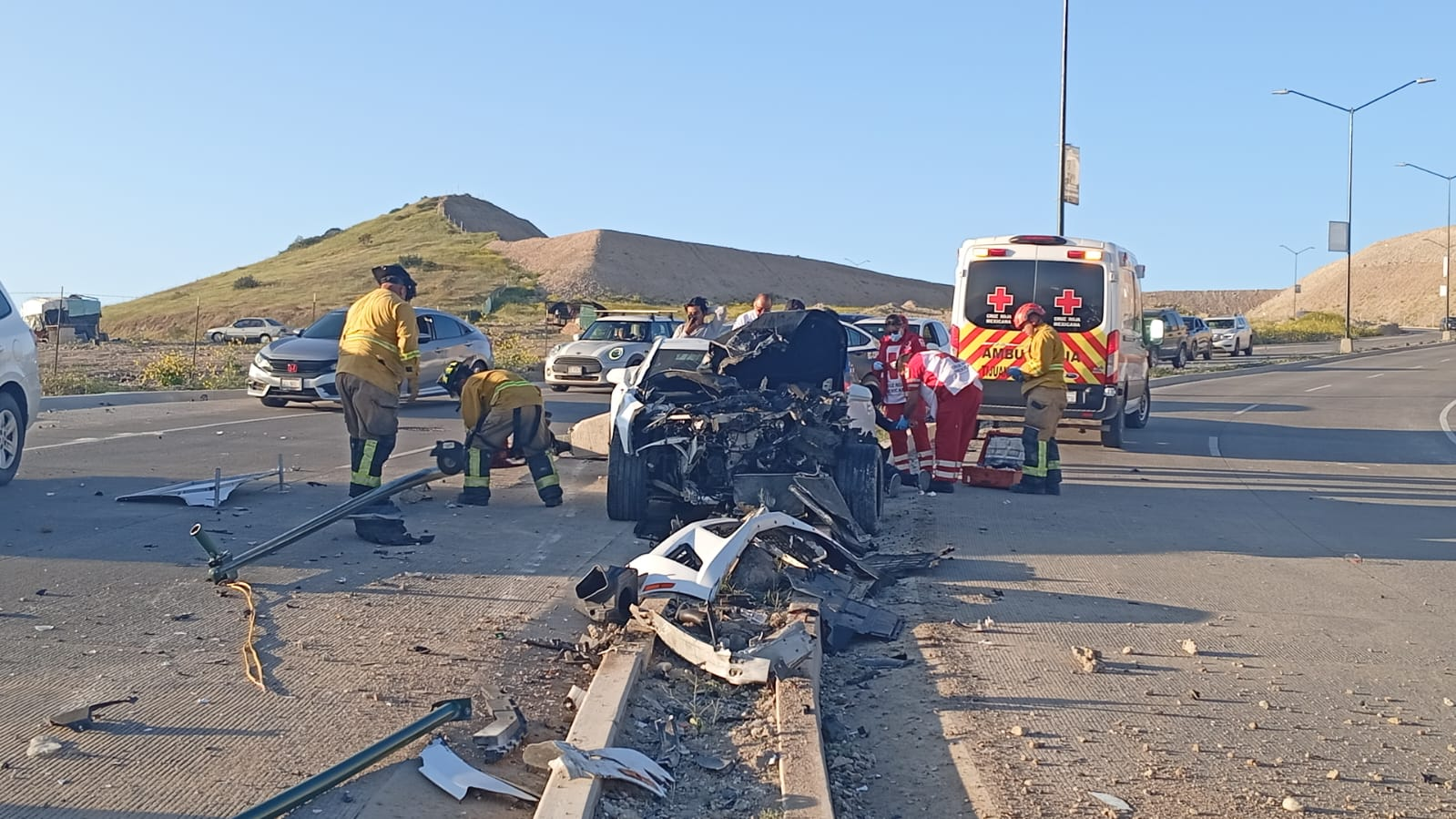 Un aparatoso accidente se registró sobre la avenida Córtez, a la altura del fraccionamiento Santa Fe, cuando un vehículo Camaro blanco, con placas de California, presuntamente a exceso de velocidad, se impactó violentamente contra un poste de alumbrado público.