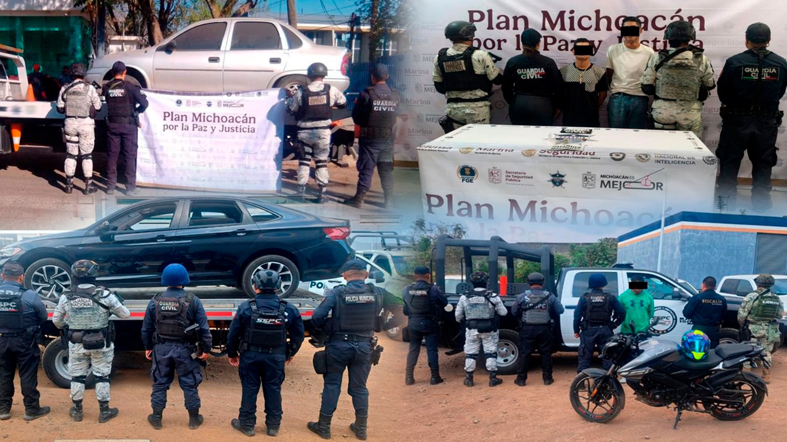 Como parte de las acciones operativas que contempla el “Plan Michoacán por la Paz y la Justicia”, elementos de la Secretaría de la Defensa Nacional (Defensa) y Guardia Nacional (GN), en coordinación con la Secretaría de Marina (Semar), Fiscalía General de la República (FGR) y Secretaría de Seguridad y Protección Ciudadana (SSPC), junto con Secretaría de Seguridad Pública (SSP) y Fiscalía General del Estado (FGE) detuvieron a cuatro personas, aseguraron cuatro artefactos explosivos improvisados y dos vehículos.